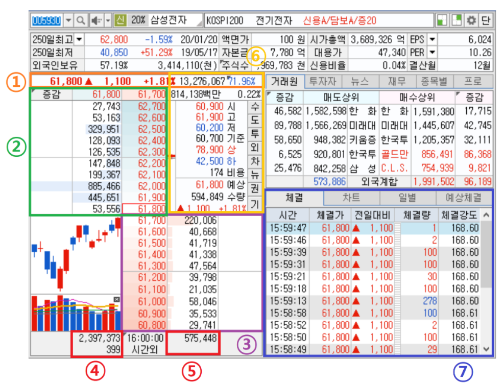 또한, 같은 이치로 ③의 호가 부분에 61,700원, 220,006이라고 쓰인 것은 61,700원에 220,006주 만큼의 매수 주문이 대기 중인 것이고 61,600원 옆의 40,668이라는 숫자는 61,600원이라는 가격에 매수하고자 대기 중인 주식 수량을 나타낸 것입니다.